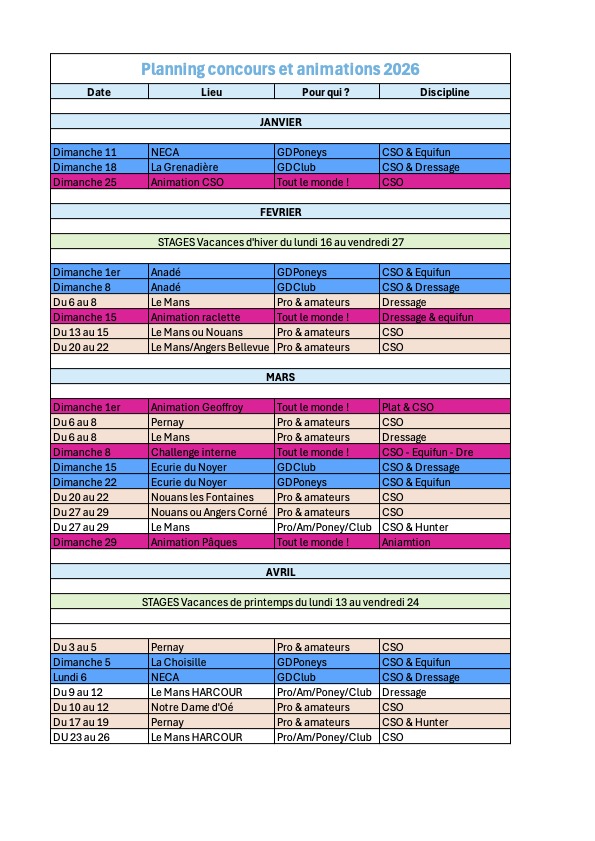 Le planning des concours & animations 2026